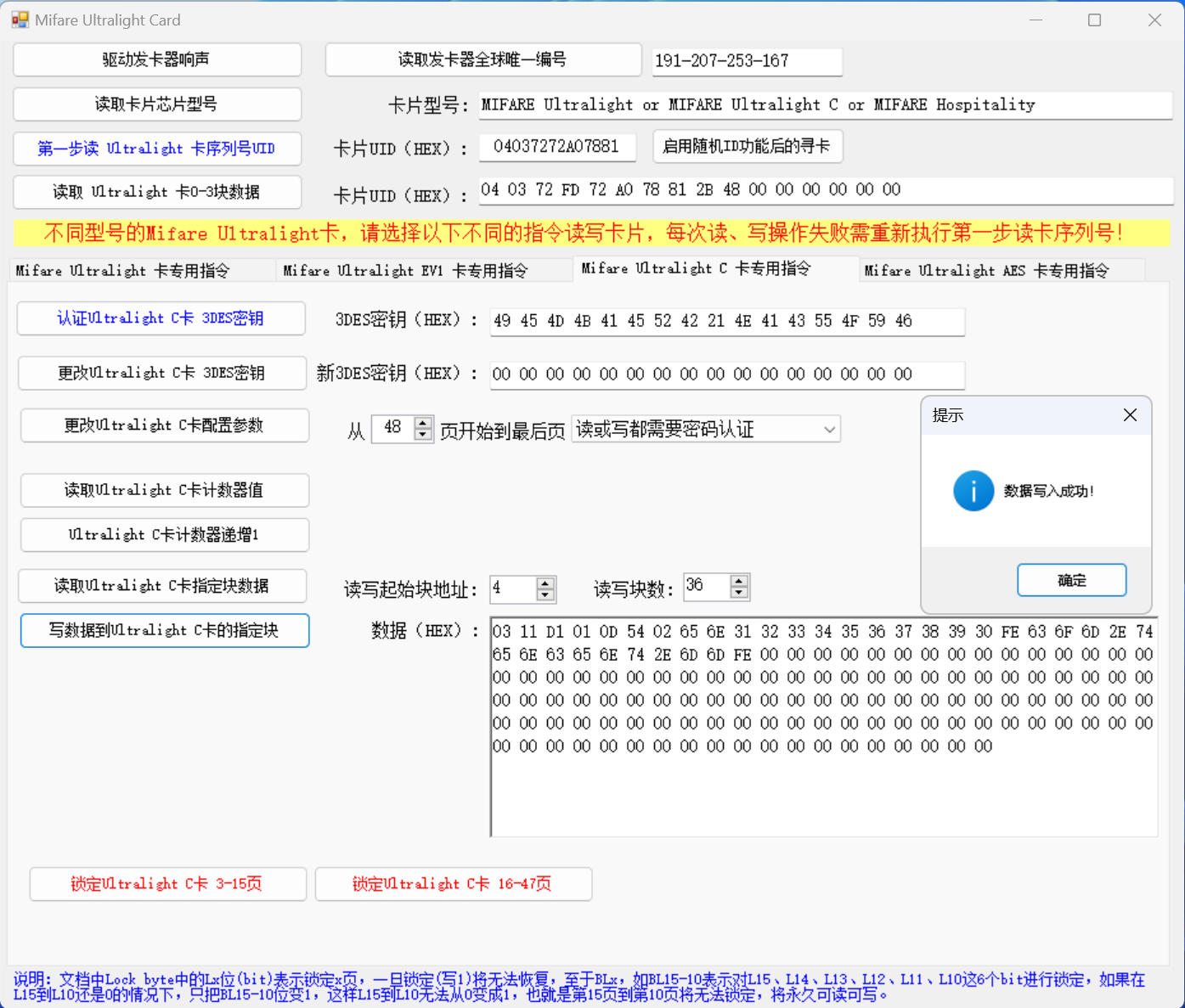 01、Mifare Ultraligth 卡无密钥功能,可直接读写数据;