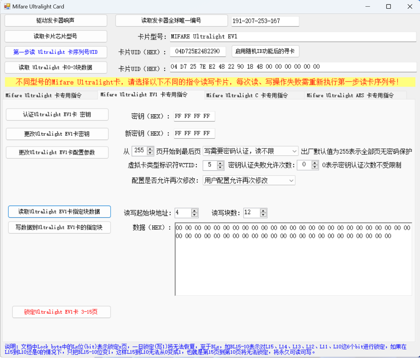 02、Mifare Ultraligth EV1卡出厂默认4字节密钥:FFFFFFFF;